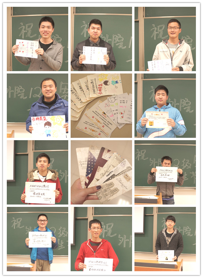 特殊的节日在重重惊喜中度过。早上7点,男生们一走进早读教室,就发现了年级中心组为他们准备的爱心早餐,伴随着黑板上“祝外院12级男生节日快乐”的大字,拉开了节日的序幕。第二轮惊喜是“魅力男生”颁奖环节,各班女生为每位男生送上了一张特制奖状,有的是男生形象漫画,有的印有男生招牌照片,奖项也根据获奖人的性格和平时表现各不相同,包括“最萌帮主奖”、“最稀有奖”、“草莓王子奖”等等,表达着班级女生对男生的美好印象和对他们闪光点的发掘。第三份惊喜礼物是抽取愿望卡,男生根据抽中的卡片可以找班级女生实现一个愿望,比如可指定女生体育课后帮忙送水擦汗,可指定女生帮买午餐并送至宿舍等等,女生表示愿意用自己的行动回馈男生平时对班级同学的关爱。最后一轮惊喜则是玫瑰派送。课间,年级每位男生都收到了一枝鲜艳的玫瑰,再次将节日气氛推向高潮,不少男生都表示是第一次收到玫瑰,显得十分羞涩。