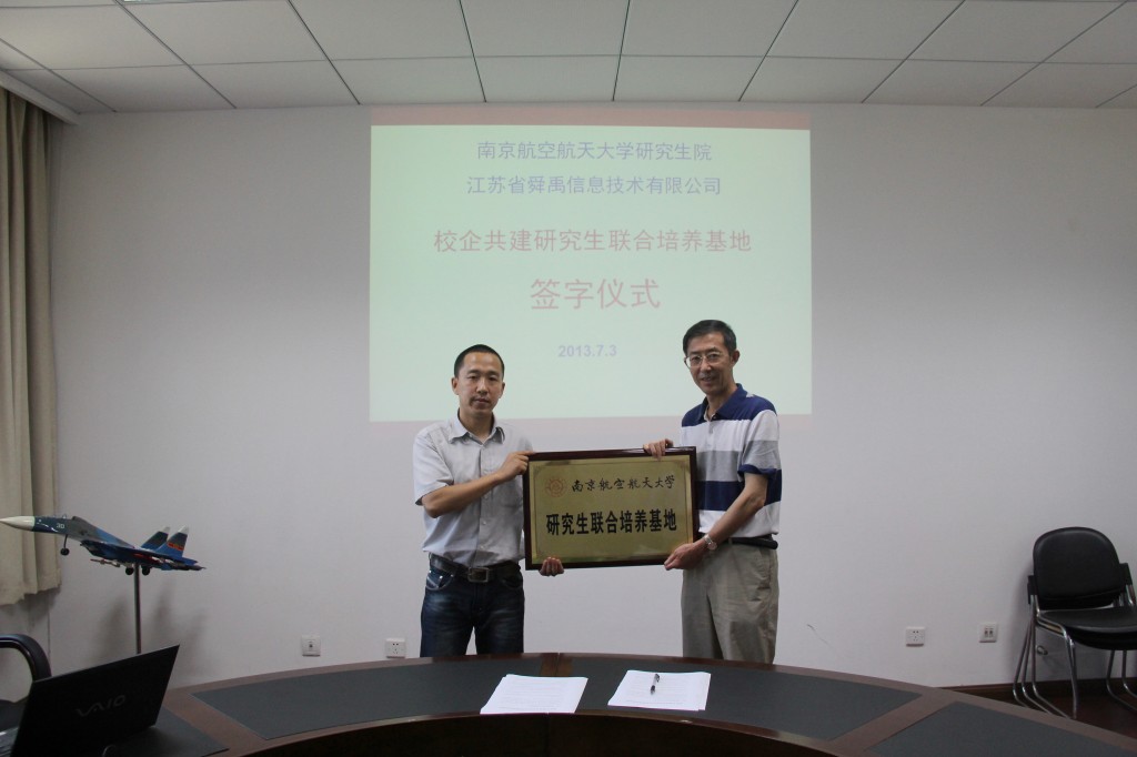 7月3日,研究生院、taptap点点官方网站与江苏省舜禹信息技术有限公司正式签约,建立MTI专业硕士“校企共建研究生联合培养基地”。江苏省舜禹信息技术有限公司常务副总经理单杰及taptap点点官方网站党委书记刘健荣、院长何江胜、副院长刘长江等出席了签约仪式。