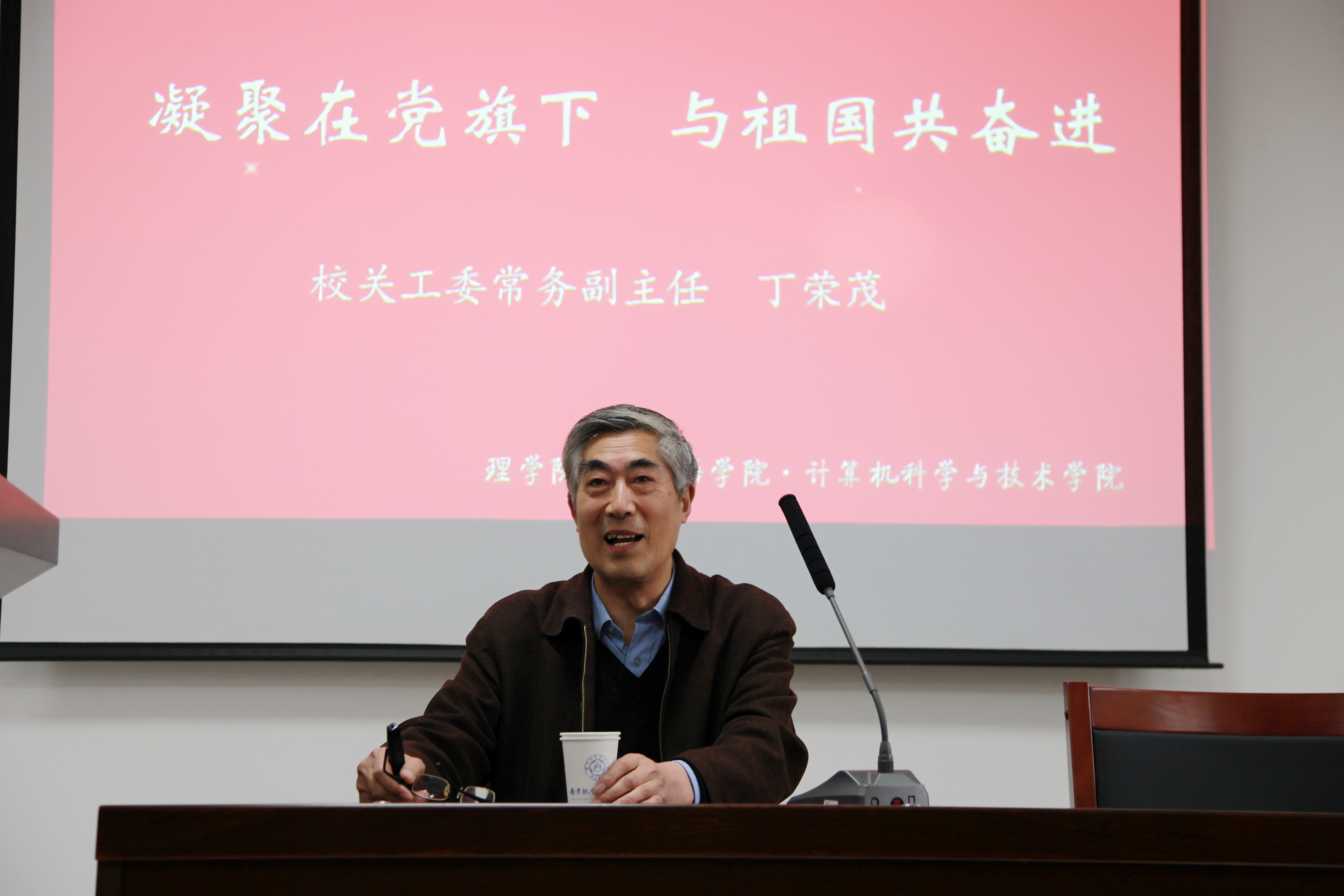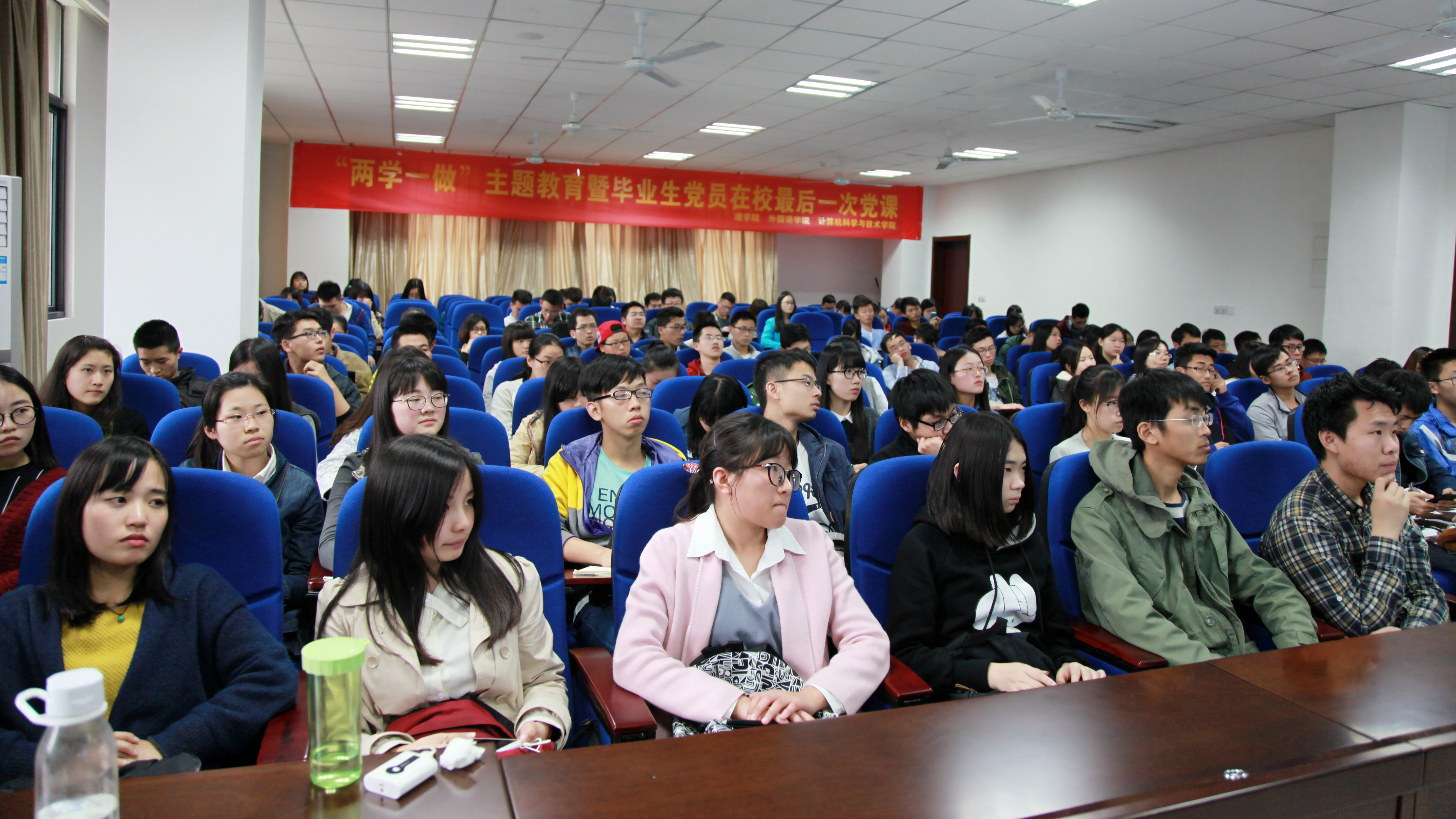 为积极响应党中央“学党章党规、学系列讲话,做合格党员”号召,推进落实点点官网“党员先锋计划”,4月27日,我院与理学院、计算机科学与技术学院联合开展的“两学一做”主题教育暨毕业生党员在校最后一次党课活动在将军路校区开展。本次活动主题为“凝聚在党旗下,与祖国共奋进”,邀请到校关工委常务副主任丁荣茂担任主讲人,来自三个学院的150余名学生党员参加了教育活动。