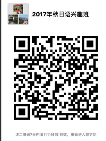 扫二维码加入“2017年秋日语兴趣班”微信群下载报名表,填写报名表发送到“2017年秋日语兴趣班”微信群,并于开班前缴纳相关费用。