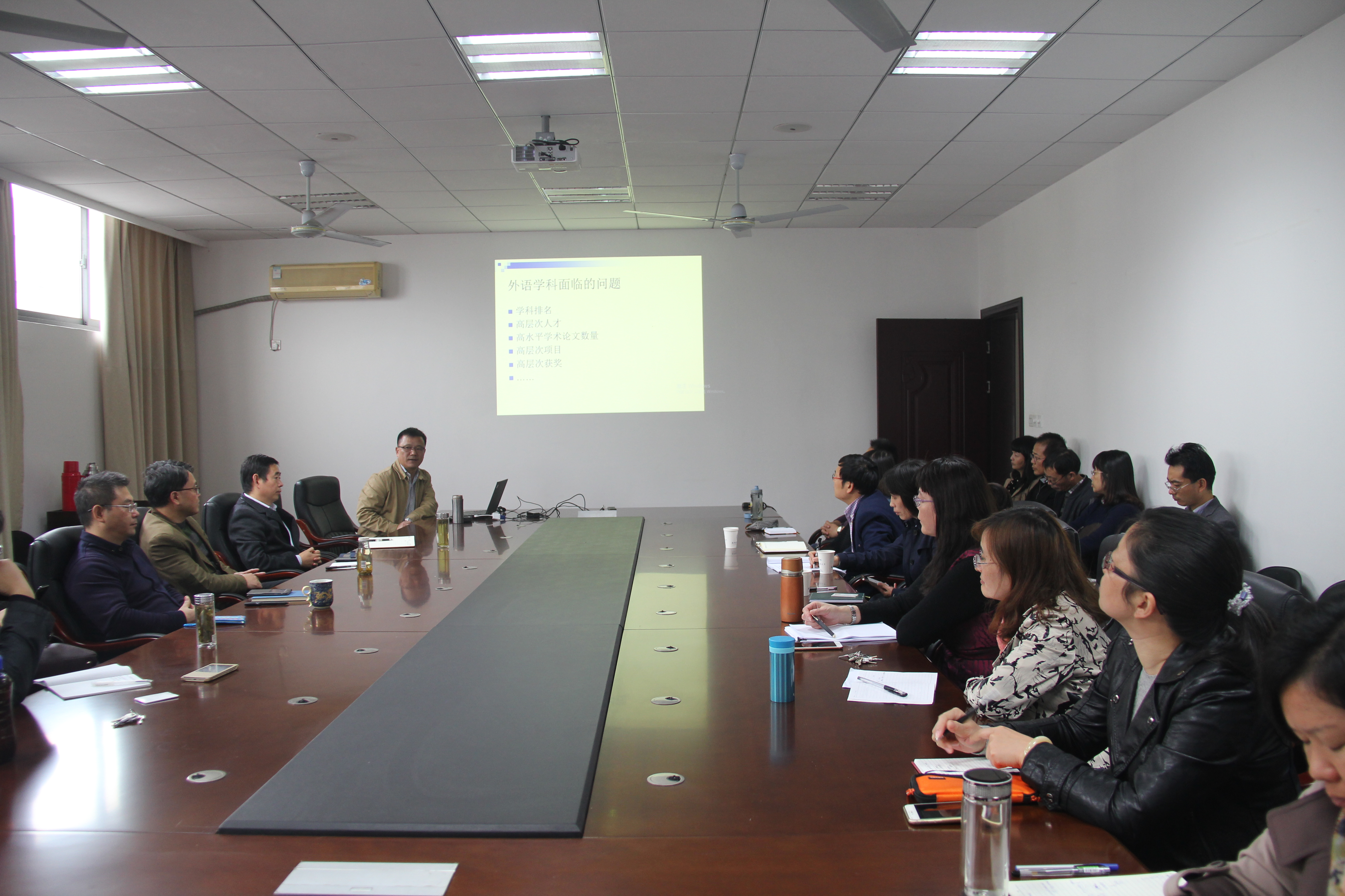 座谈会由院长范祥涛教授主持,首先回顾了我院近年来的工作情况,肯定了学院在外语学科排名、高层次人才引进、高水平学术论文的发表、高层次项目的申报、高层次获奖等方面做出的努力和取得的成就,同时也指出了外语学科近几年来所面临的的问题。
