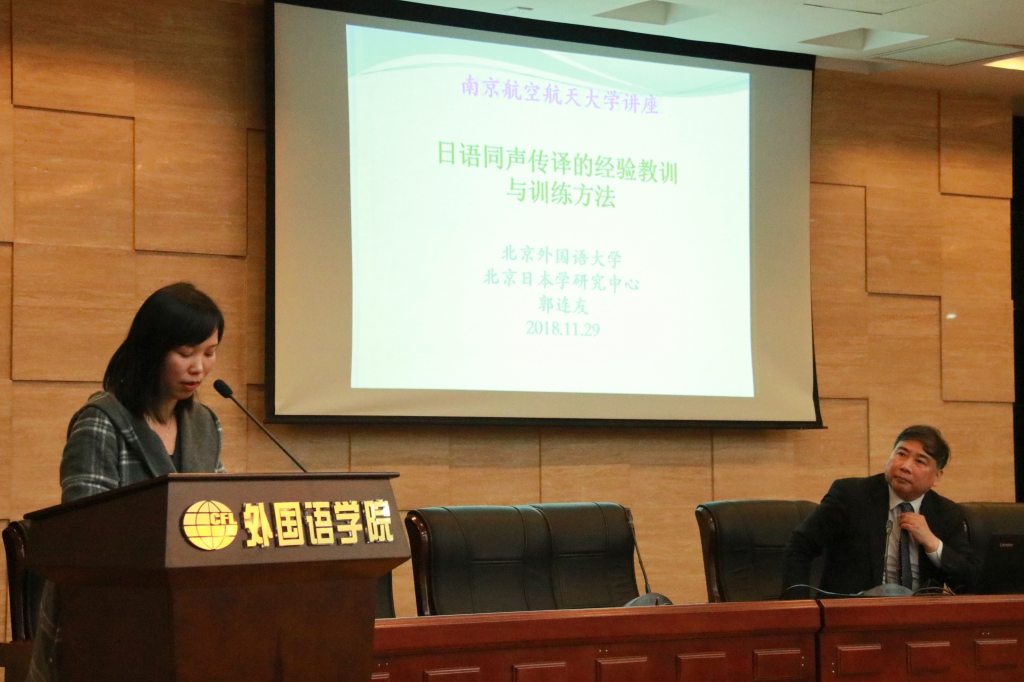 11月29日(周四)19时许,北京外国语大学日本学研究中心主任、博士生导师、中国日语教学研究会副会长郭连友教授在taptap点点官方网站国际会议中心举办了题为“日语同声传译的经验教训与训练方法”的学术讲座。我院日语系周菲菲老师主持了本次讲座,学院徐以中副院长、日语系师生及部分英语专业师生聆听了此次讲座。