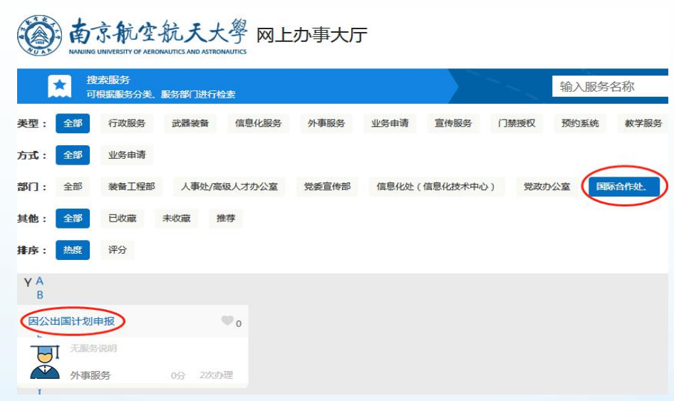 3. 本次申报与往年不同,采取网上申报方式。请教职工 凭工号登陆校网上办事大厅 https://ehall.nuaa.edu.cn,登陆后 在部门内点击“国际合作处”,后点击下方“因公出国境计划申报”进行申报填写,如下图所示: