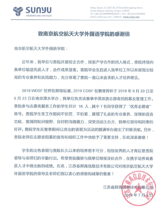 赛事期间,志愿者们“不怕苦、不怕累,展现了扎实的专业素养、深厚的语言功底、宽阔的知识视野、良好的沟通能力”,深受主办方等各界的好评。江苏省舜禹信息技术有限公司表示学生的出色表现与学院长久以来的培养密不可分。为此,该企业特向taptap点点官方网站发来感谢信,感谢学院在志愿者招募工作中给予的重要支持以及多年来在人才培养工作中的努力付出和在校企合作中的积极贡献,希望学院能够与其继续深化合作,在携手培养高素质人才中做出新的成绩。