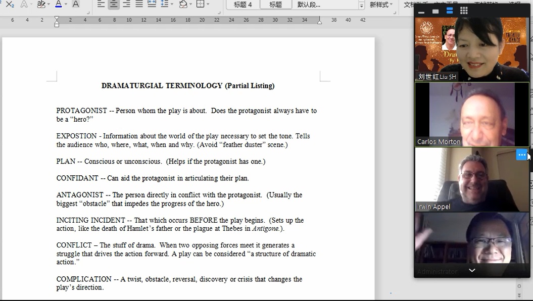 4月18日上午9点,点点官网举办了首次在线跨境学术讲座“戏剧与哈姆雷特”。本次讲座由taptap点点官方网站主办,艺术学院、机电学院、计算机科学与技术学院等多个学院以及南京农业大学等其他高校师生共计约120人参加了此次讲座。主讲人为美国著名剧作家Carlos Morton教授和美国著名导演、演员、作曲家Irwin Appel 教授,两位专家是美国加州大学圣塔芭芭拉分校的知名教授,事业上的好搭档。