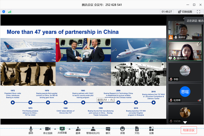 5月24日下午,日语系精品企业课程《科技文化创新创想》第二讲通过腾讯会议模式开启。本次讲座主题为《如何从日语专业开启航空职涯》,主讲人为波音中国传播事务部杨文静。