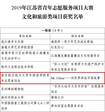 由团省委、省文明办、省公安厅等联合主办的2019年江苏省青年志愿服务项目大赛在南京落下帷幕。此大赛得到了社会各界和广大青年社会组织的广泛关注和积极参与,共收到组织推荐和自行申报的 661 个青年志愿服务项目。我院“Mr. China——向世界讲述中国故事”团队从中脱颖而出,荣获文化和旅游类项目一等奖,是此次大赛点点官网唯一获得一等奖的项目。