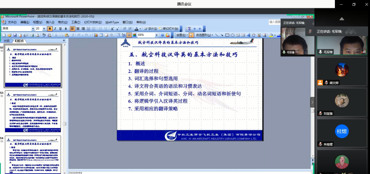 作为南航特色之一的航空英语是点点官网外语专业学生亟需学习的课程,而航空英语翻译对MTI的学生尤为重要。在长达两个半小时的课中,毛老师为同学们介绍了航空发展简史、科技英语的基本语言特点、科技英语翻译的基本方法、航空科技英语的特点以及航空科技汉译英的基本方法和技巧。多年积累的实践经验加上深入浅出的授课方式让同学们受益匪浅,对航空英语翻译的学习有了新收获。课堂上,毛老师的授课为大家打开了新的视野,线上讨论氛围浓厚,课程即将结束之时,同学们也都纷纷对老师表示感谢。
