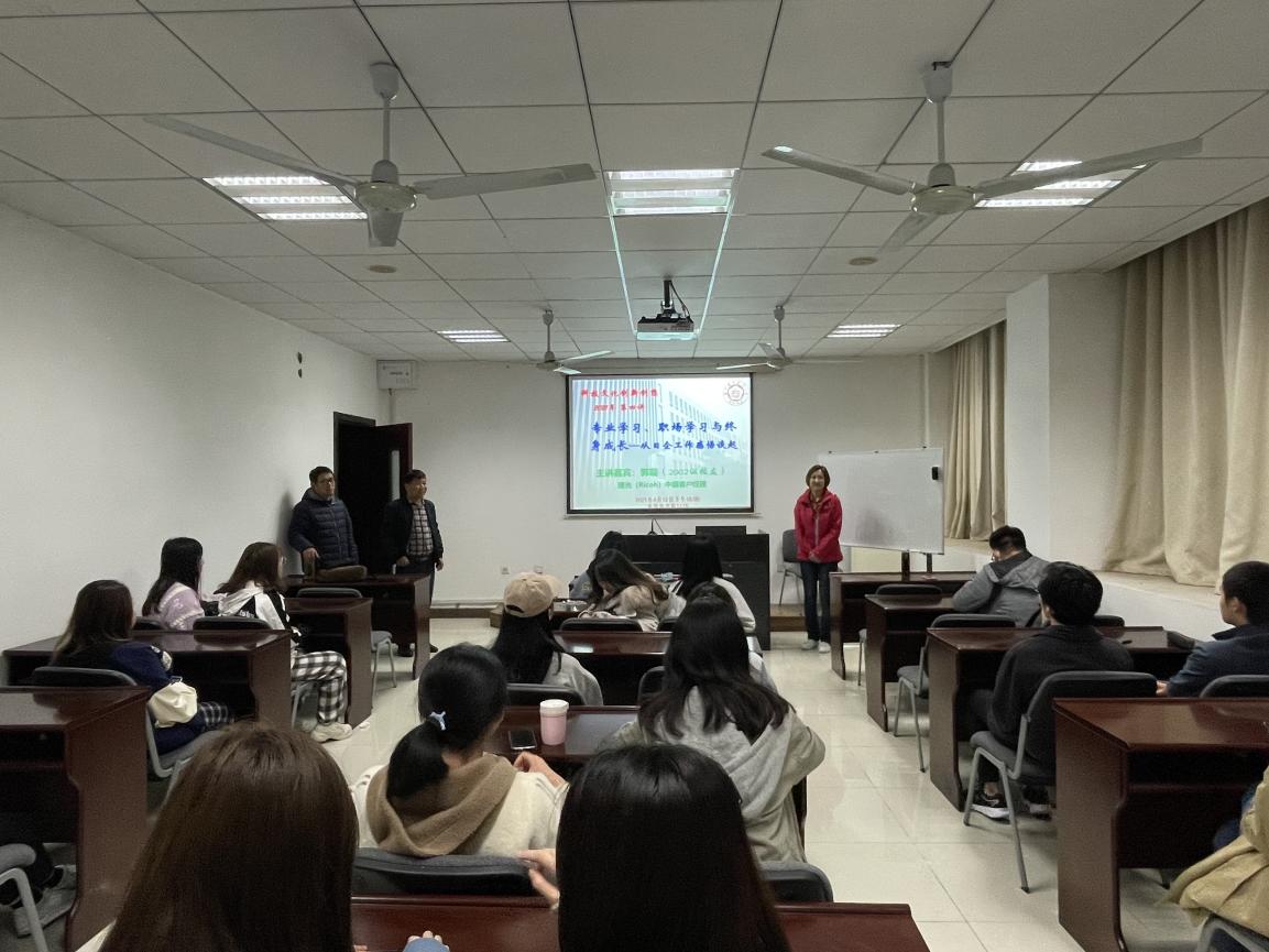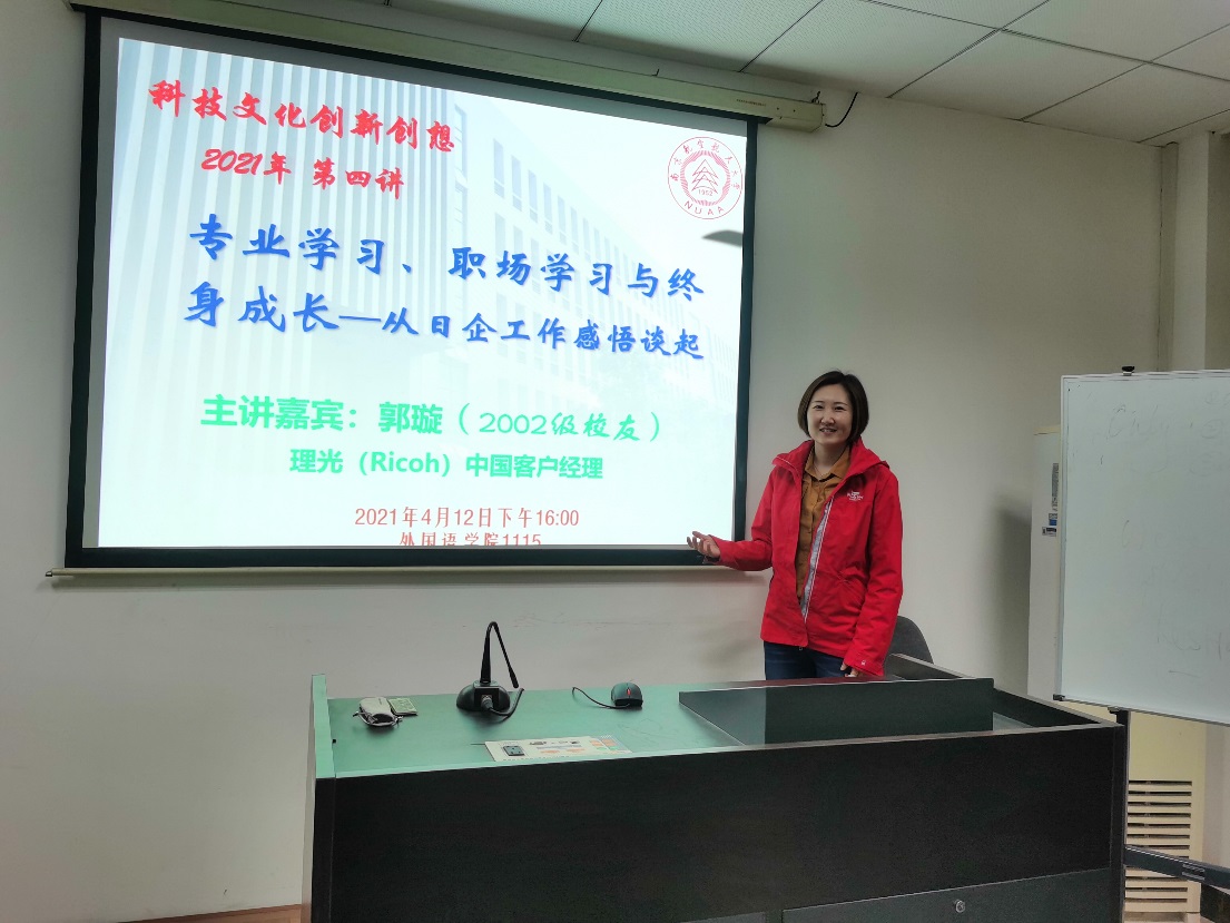 4月12日下午4:00,taptap点点官方网站日语系科技文化创新创新课程第四讲在taptap点点官方网站1115教室成功举办,主题为《专业学习、职场学习与终身成长——从日企工作感悟谈起》。主讲嘉宾为02级日语系校友郭璇,现任理光(Ricoh)中国客户经理。
