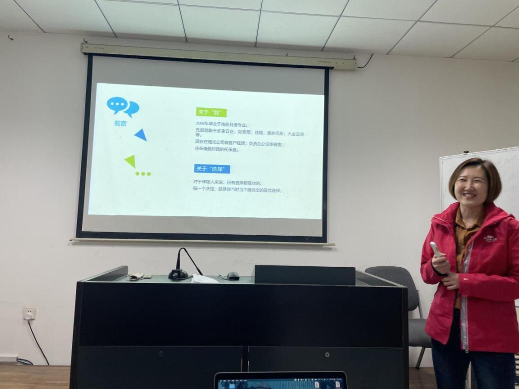 讲座中,郭璇首先与同学们分享了自己毕业以来在日企的工作经验,同时针对日语系学生毕业后的选择,提出了自己的看法。“对于年轻人来说,所有的选择都是对的。每一个决定,都是你当时当下能做出的最优选择。”郭璇的这句话让同学们印象深刻,她鼓励同学们趁年轻多尝试,多勇敢地做出自己的决定,每一段经历都会成为生命中宝贵的财富。“虽然有些岗位不适合自己,但是当时学到的东西会对之后的工作有益处。”在多个日企有过工作经历的郭璇将自己的经历总结为这句话。
