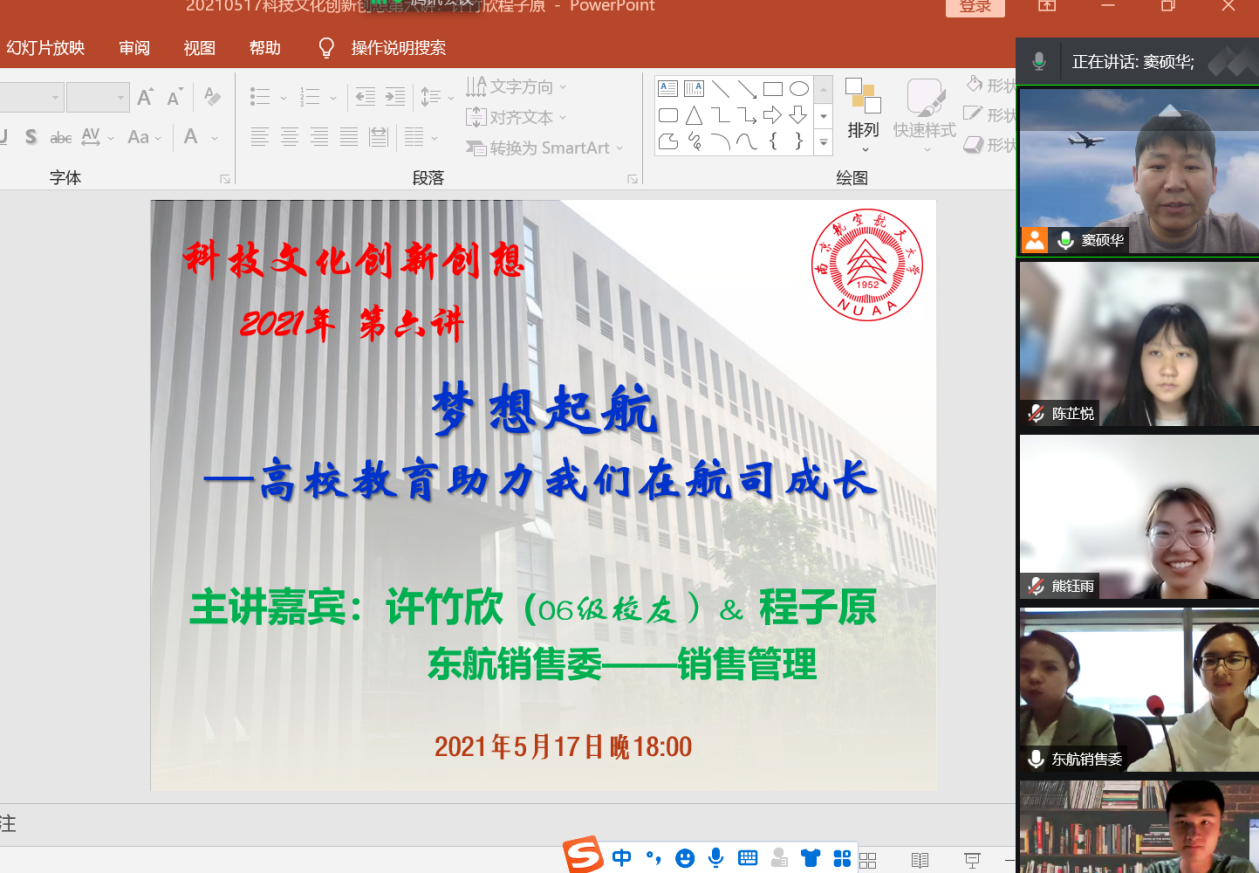 5月17日晚18点,taptap点点官方网站日语系《科技文化创新创想》第六讲通过腾讯会议开启,主题为《梦想起航——高校教育助力我们在航司成长》,主讲人为东航销售委的许竹欣和程子原两位优秀代表,其中许竹欣为南航06级校友。