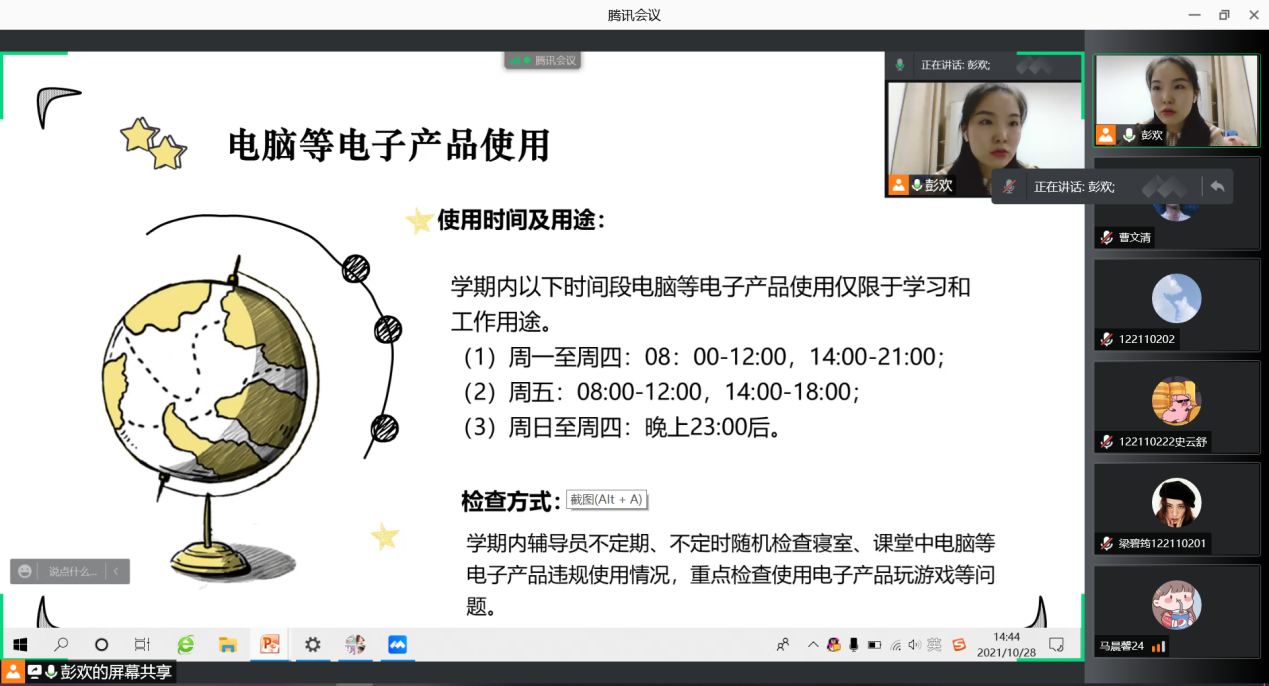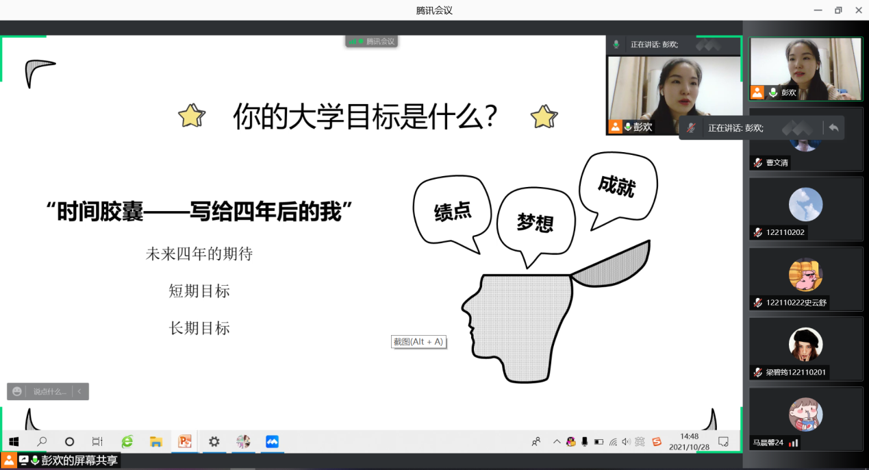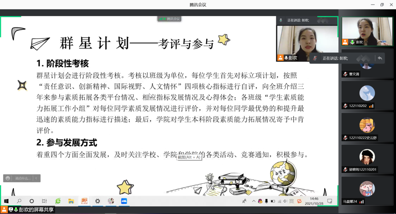 为了增进大一新生对校院制度及“群星计划”学生素质拓展平台的了解,更好地帮助新生们适应大学生活, 10月28日下午,taptap点点官方网站在线上腾讯会议平台召开了2021级本科新生“群星计划”主题年级会。2021级本科生辅导员彭欢、兼职辅导员曹文清,2021级全体新生参加会议,会议由彭欢主持。