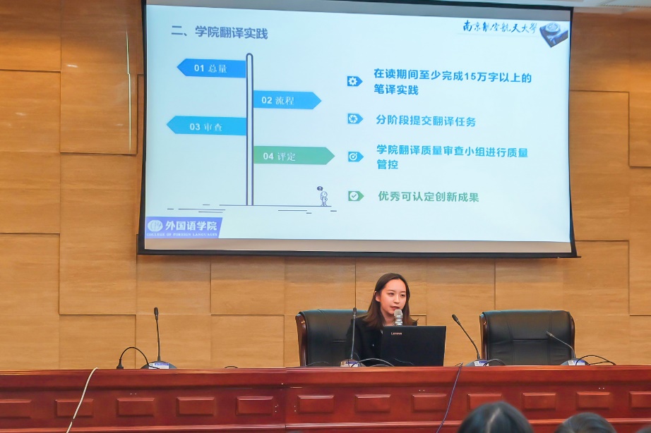 随后,邹馨茗介绍了翻译方向的实习实践管理办法,并嘱托大家按照学习计划踏踏实实完成,付出必定有所收获。