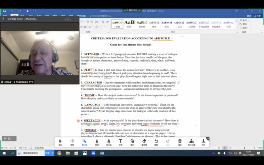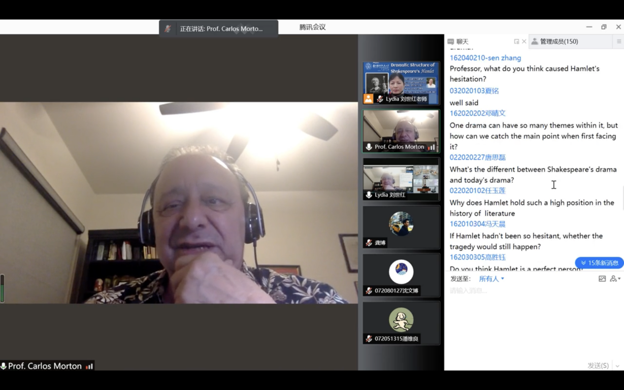 讲座由taptap点点官方网站国际联络中心主任刘世红副教授主持,共分为三个环节。第一环节为电影赏析,刘世红播放并分析1948年经典版的哈姆雷特电影的重点片段,让大家对作品情节有更多的了解。第二个环节中,Carlos Morton教授结合《哈姆雷特》为大家介绍了主角、情节、反面角色、事件、矛盾冲突、高潮等戏剧要素,随后又为大家讲解了基于亚里士多德戏剧理论的对于戏剧的评价标准。第三个环节为教授与学生的互动环节,同学们在软件聊天室或者开麦积极发言分享观点,主要围绕《哈姆雷特》相关剧情、创作背景、莎士比亚自身经历、以及剧作的现实意义等话题展开。Carlos Morton教授就同学们的问题一一给出解答,互动积极、气氛活跃,讲座共持续两个半小时。