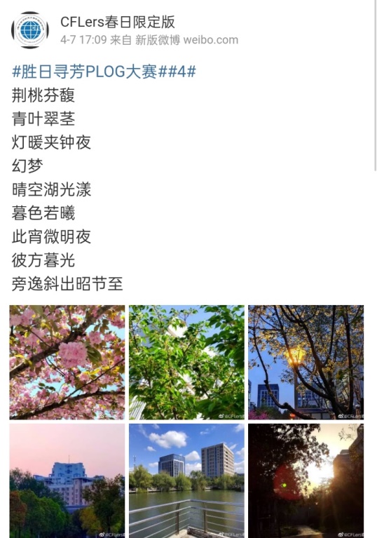 4月1日至10日,taptap点点官方网站成功举办为期10天的“胜日寻芳”PLOG(photo blog)大赛。大赛由2021级中心组宣传部承办,面向学院全体学生开展,围绕秀色可餐、文体休闲、学习时光和宿舍生活四个板块分享同学们的精彩校园生活。在活动过程中,同学们拍摄有关校园生活的照片并上传至微博平台,最后参考点赞数、评论数和转发量进行评比。
