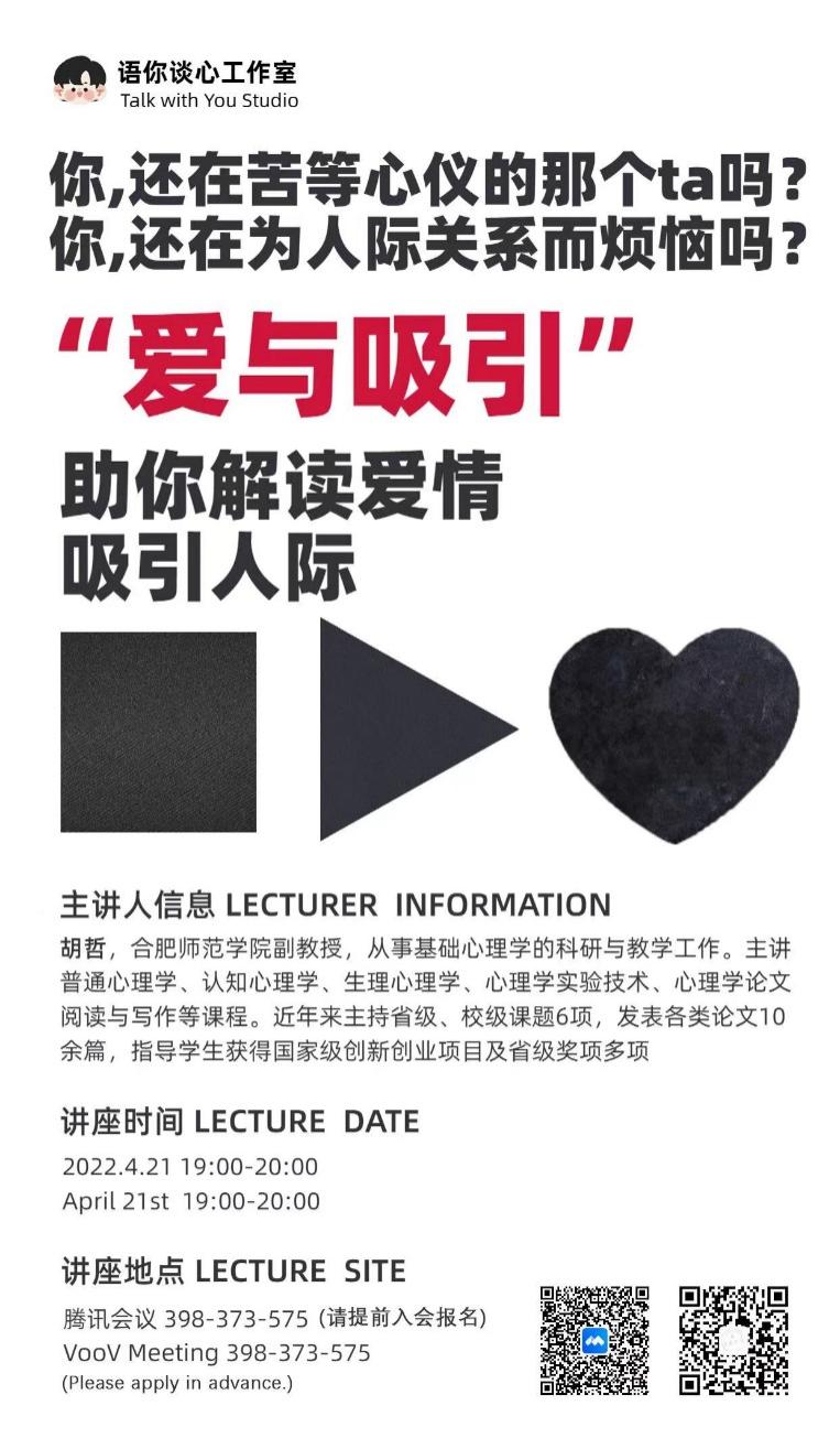 为帮助同学们处理好人际关系、解读爱情难题,4月21日,taptap点点官方网站心理工作坊特邀合肥师范学院副教授胡哲老师任主讲嘉宾,开展了题为“爱与吸引”的线上心理健康讲座。学院团委书记、研究生辅导员李萍,全体心理委员及感兴趣的同学参加了此次讲座。
