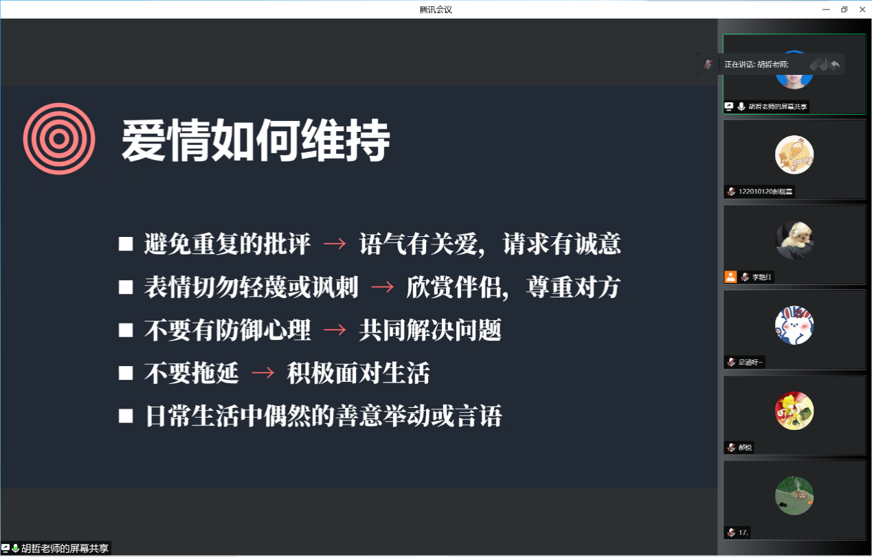 首先,胡哲就人际吸引,解析爱的误区,阐释了七种自身吸引力的影响因素,这引起了许多同学的共鸣。之后他又补充了个人吸引力的因素,将提高人际吸引的方式娓娓道来。