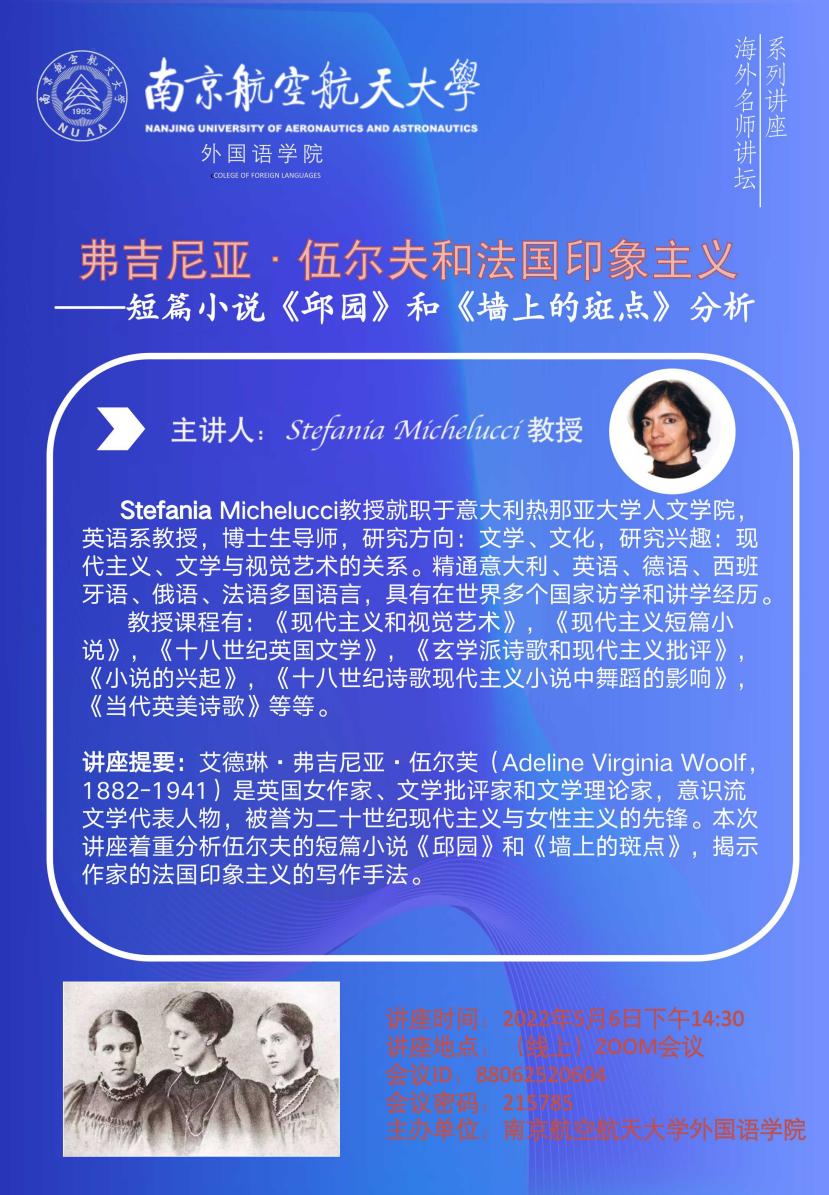 2022年5月6日下午14:30,taptap点点官方网站主办了又一场”海外名家讲坛”系列的跨境线上讲座,主讲人为意大利热那亚大学校长助理、人文学院英语系教授Stefania Michelucci,讲座主题为“弗吉尼亚·伍尔夫和法国印象主义—短篇小说《邱园》和《墙上的斑点》分析”。本次讲座别开生面,不仅有南航、南农师生等高等院校通过线上形式参与,同时意大利热那亚大学师生在线上和线下聆听,是一场中意师生共同参与的线上国际课堂。