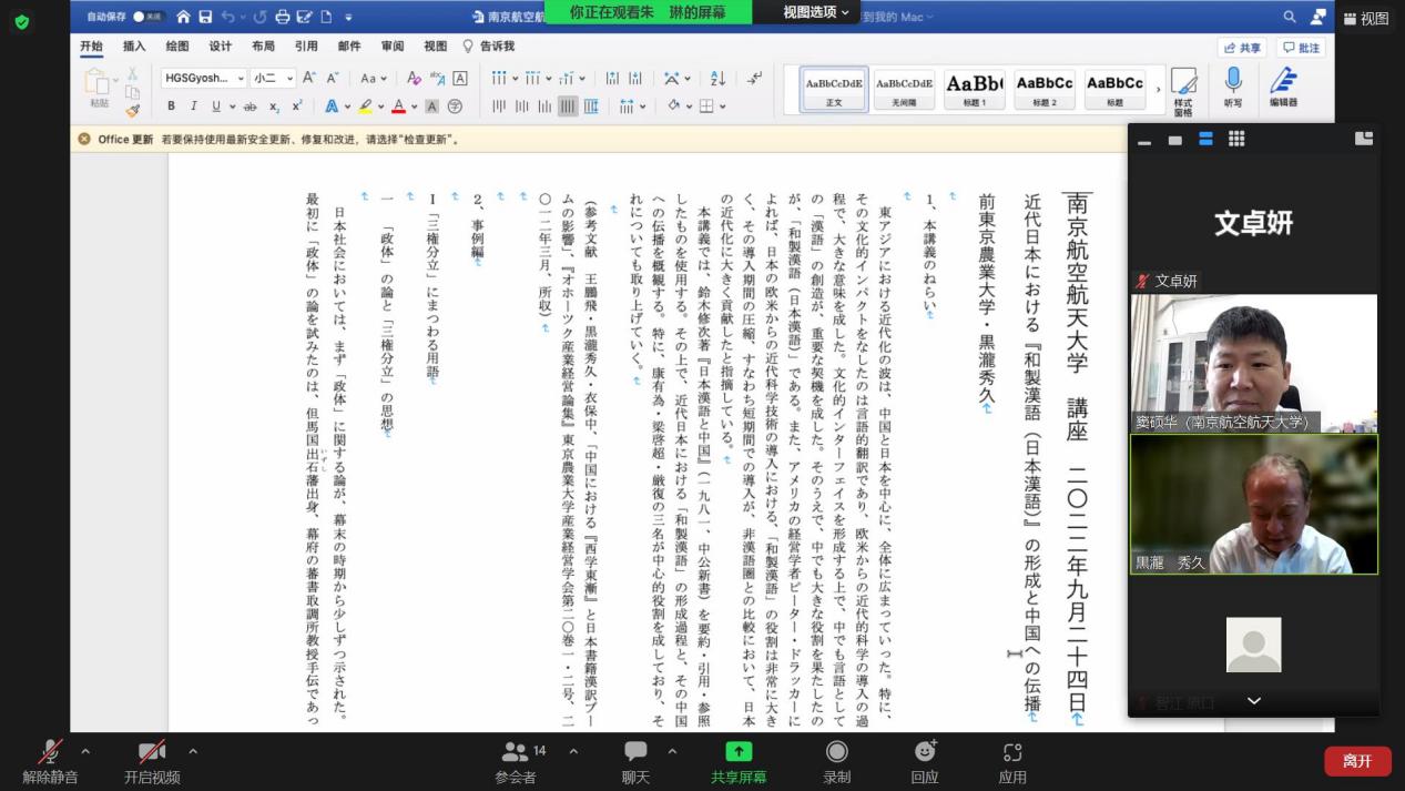 讲座由日语系主任窦硕华主持。窦老师首先向大家简要介绍了黒瀧秀久教授的基本情况,并对线上参与本次讲座的师生表示欢迎。讲座中,黒瀧教授详细解释了“和制汉语”在日本的形成,并介绍了梁启超等中国志士对新词汇、新思想的引进,最后从词汇学角度比较了中日词汇含义的异同。