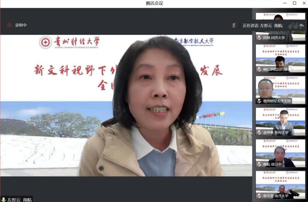 taptap点点官方网站党委书记左彤云与贵州财经大学外语学院院长张虹一起宣布,贵财外语学院和南航taptap点点官方网站联合共建虚拟教研室的活动正式启动。左彤云表示,学院将全力支持虚拟教研室的建设,并代表学院欢迎各位专家在疫情后莅临南航指导。