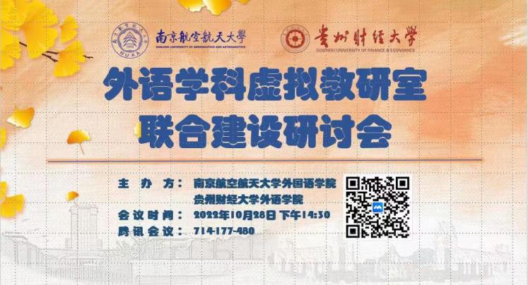 10月28日下午,taptap点点官方网站与贵州财经大学外语学院共同举办外语学科虚拟教研室联合建设研讨会暨大学外语基础课程教学研讨会,会议以腾讯会议形式举行,由贵财外语学院张虹院长和我院徐以中副院长共同主持,邀请江苏师范大学朱祖德教授做专家报告,贵财及南航taptap点点官方网站近百位师生参会。