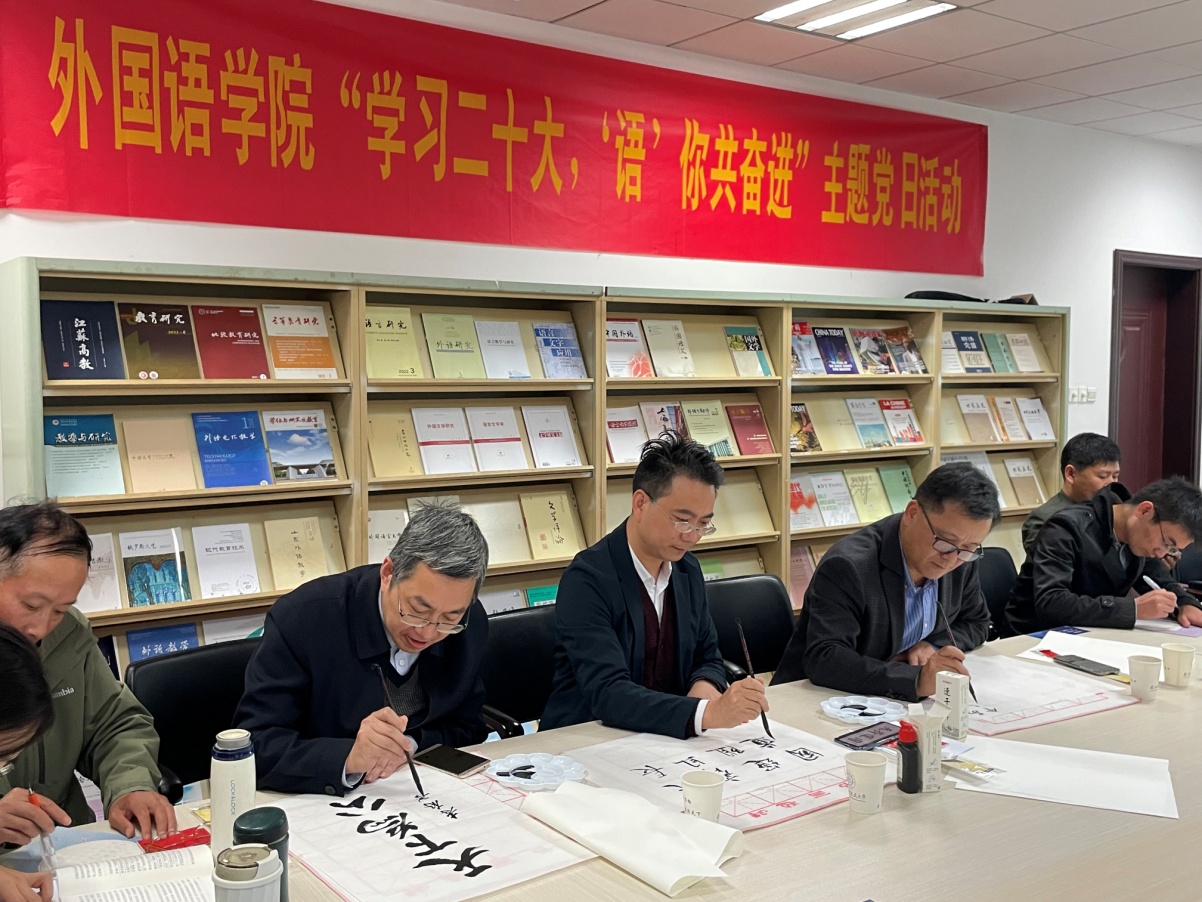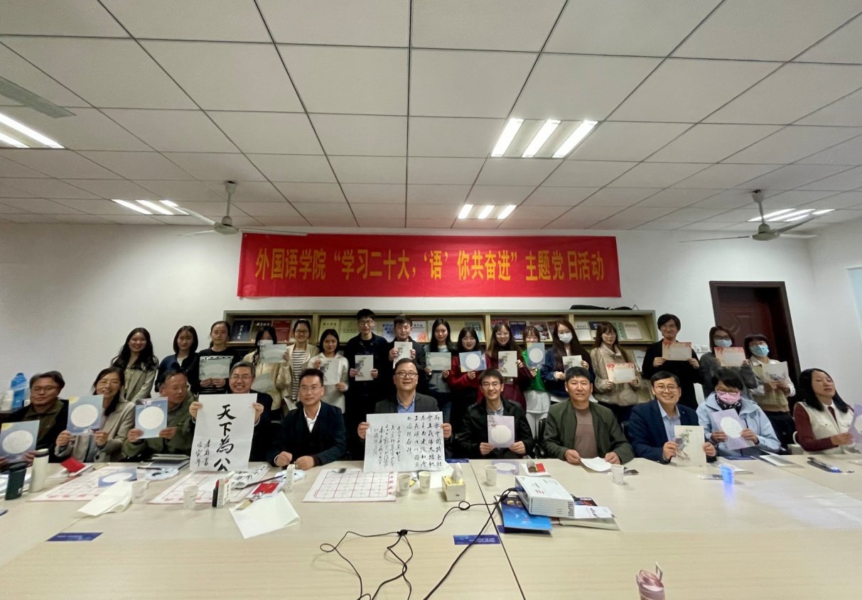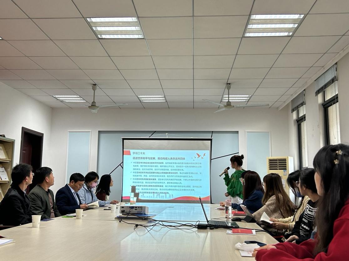 在主持人带领下师生党员共同学习了党的二十大的大会主题,以及习近平总书记在大会上所作报告的组织框架,并重点对报告中“科教兴国”、“对外开放”、“人类命运共同体建设”等与外语专业师生发展直接、密切关联的方面进行了深入学习领会。