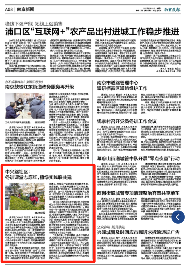 近日,《南京晨报》报道了taptap点点官方网站联合雨花台区梅山街道中兴路社区开展“传承红色基因,争当绿色使者”劳动教育主题冬训活动。本次活动利用一年一度的植树节开展志愿服务,有效推动党建带团建深入基层,为大学生党员、团员提供参与基层实践的机会。学院团委书记李萍、本科生联合党支部书记彭欢、学生党员代表团员代表及中兴路社区党员代表参与了本次活动。