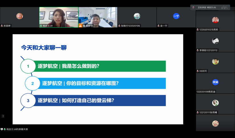 4月14日下午,日语系精品企业课程第三讲(“志在蓝天,航空报国”2023年度讲座之二)通过腾讯会议成功举办。本次讲座主题为《逐梦航天,你需要做什么准备?》,主讲人为2004级校友杨文静,来自波音中国传播事务部。日语系窦硕华老师主持了讲座, 2020级和2021级本科生参加了讲座。