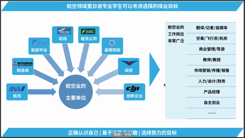 为了更切实的让同学们了解航空业,杨文静讲解了日语专业学生将来在航空领域可以从事的方向,并为每个方向的工作内容、工作性质等方面进行了介绍,其中包含租赁公司、航空业制造商等并不被广泛了解的航空业单位,拓宽了在校生的视野。