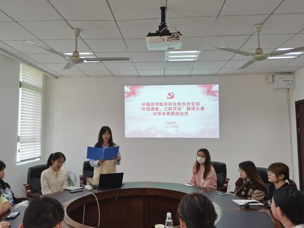 为学习贯彻习近平新时代中国特色社会主义思想,教育引导广大学生党员坚持学思用贯通、知信行统一,4月26日,taptap点点官方网站本科生联合党支部“外语通途,三航华章”翻译大赛分享会暨颁奖仪式在taptap点点官方网站327会议室举行。学院英日联合党支部书记钟勇、英日联合党支部纪检委员信慧敏、本科生联合党支部书记彭欢及本科生党员、入党积极分子获奖代表参加了本次活动。