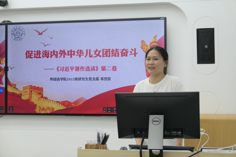 taptap点点官方网站2022级研究生党支部书记邓昱欣领学《习近平著作选读》第二卷“促进海内外中华儿女团结奋斗”,并结合自身在江苏发展大会上的志愿服务经历,以及过程中帮助参会嘉宾中国旅美律师协会会长申春平的故事,讲述了海内外中华儿女的家国情怀,阐述了新时代爱国统一战线的丰富内涵和时代价值。