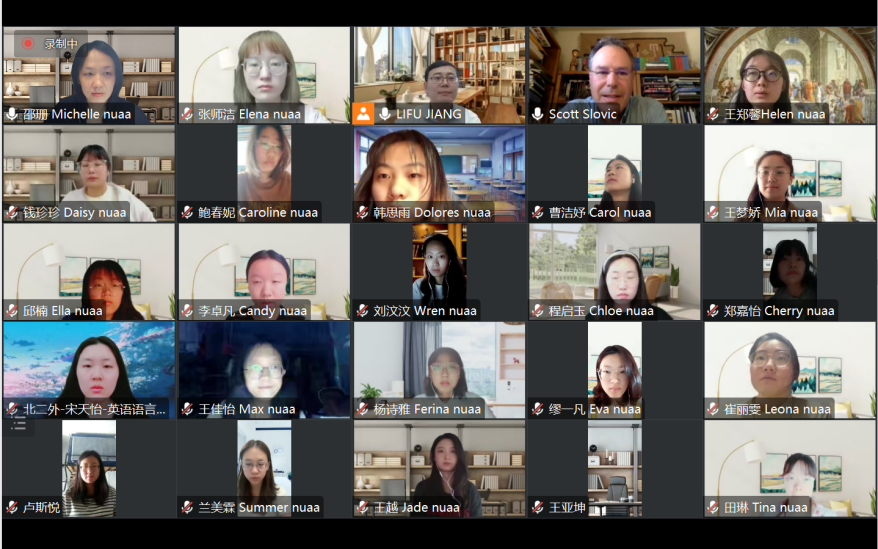 讲座最后,Scott教授与同学们进行了深入讨论,热情地为同学们解答困惑。多位同为分享了自己对这两次讲座的心得感悟,并且提出了丰富的问题:如何从心理上应对生态悲伤、对于地球目前所面临的挑战该如何采取行动、对于因生态灾害引发的负面情绪,导致更多人避免直面气候问题这一现象该如何看待,如何平衡保护自然和资源开采,气候小说在表现气候变化方面与其他文学形式有何不同等,最终这些问题都一一得到了Scott教授的专业而又全面的解答。经过此次讲座,同学们获益匪浅,满载而归,十分期待与教授的下次见面!