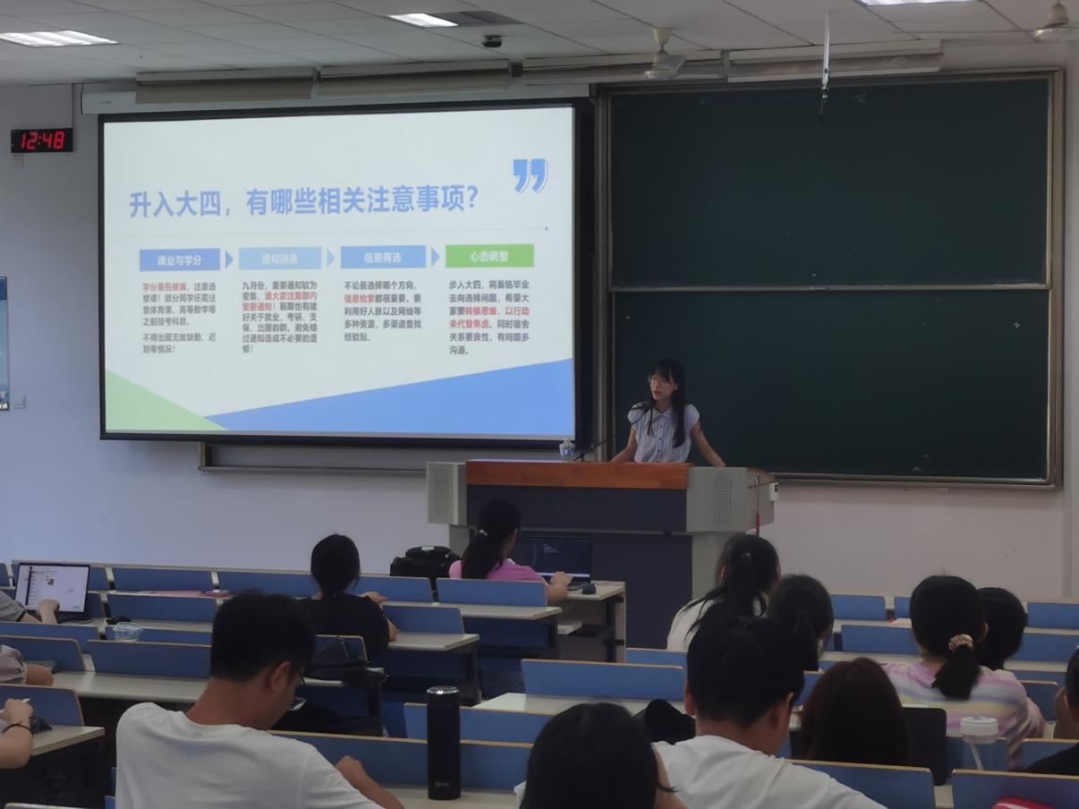 首先,辅导员赵瑜瑶大致介绍了近6年来taptap点点官方网站本科生的升学率与就业情况,引导同学们要理性分析考研与就业形势,合理定位。之后,强调升入大四后,同学们要注意学分是否修够,多关注年级群内重要消息通知,并注意心态调整等。