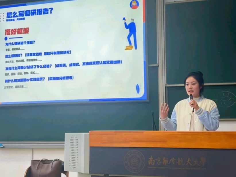 其次,是知行合一,当好“宣传员”。应该从现在起努力培养创新精神,积极投入各项创新创业项目的实践中,努力发挥专业特长,利用专业特色创新对外话语表达方式,将来为讲好中国故事、提供中国方案积极助力。本次讲评特别邀请到2022-2023学年校长特别嘉奖获得者,来自经济与管理学院的张瀚茹为同学们带来她带领团队获第十八届“挑战杯”全国特等奖的经验分享,从比赛选择、选题定题、调研报告撰写等方面分享经验与心得。此次分享激励了同学们在今后的学习生活中积极参与各项创新创业项目,培养创新精神。