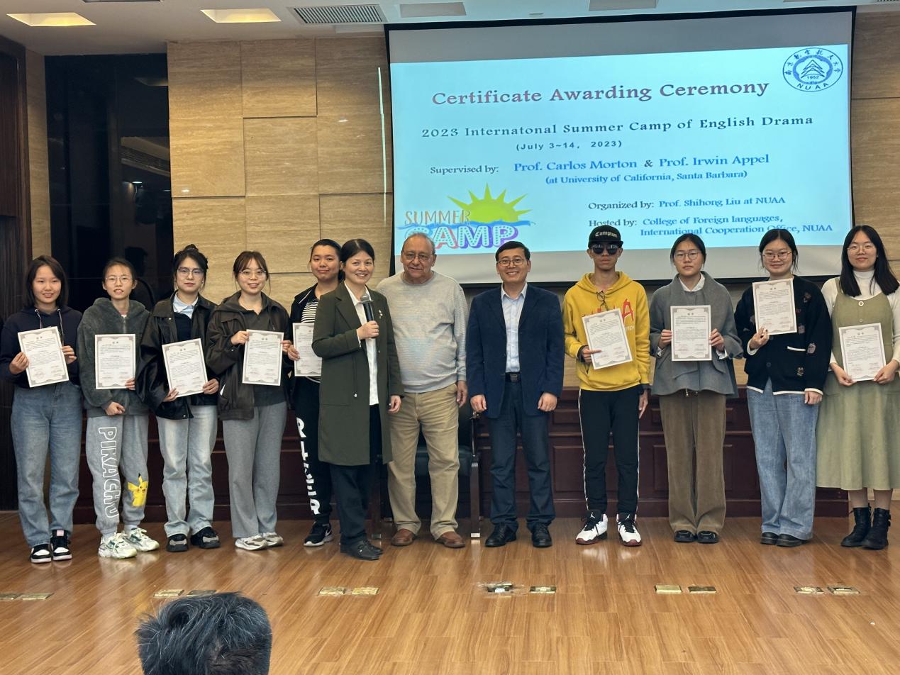 表演正式开始之前,进行了学校暑期国际课程“2023年度英语戏剧国际夏令营结营证书”发放仪式,该国际夏令营课程为taptap点点官方网站策划的特色国际课程、也是院团委组织的大学生暑期社会实践活动,目前已经连续举办四期,由加州大学的两位教授卡洛斯·莫顿和欧文·爱普(Irwin Appel)联袂执教,成为暑期课程中的热门课程。taptap点点官方网站副院长姜礼福教授和卡洛斯·莫顿教授亲自为学生们颁发了结营证书。