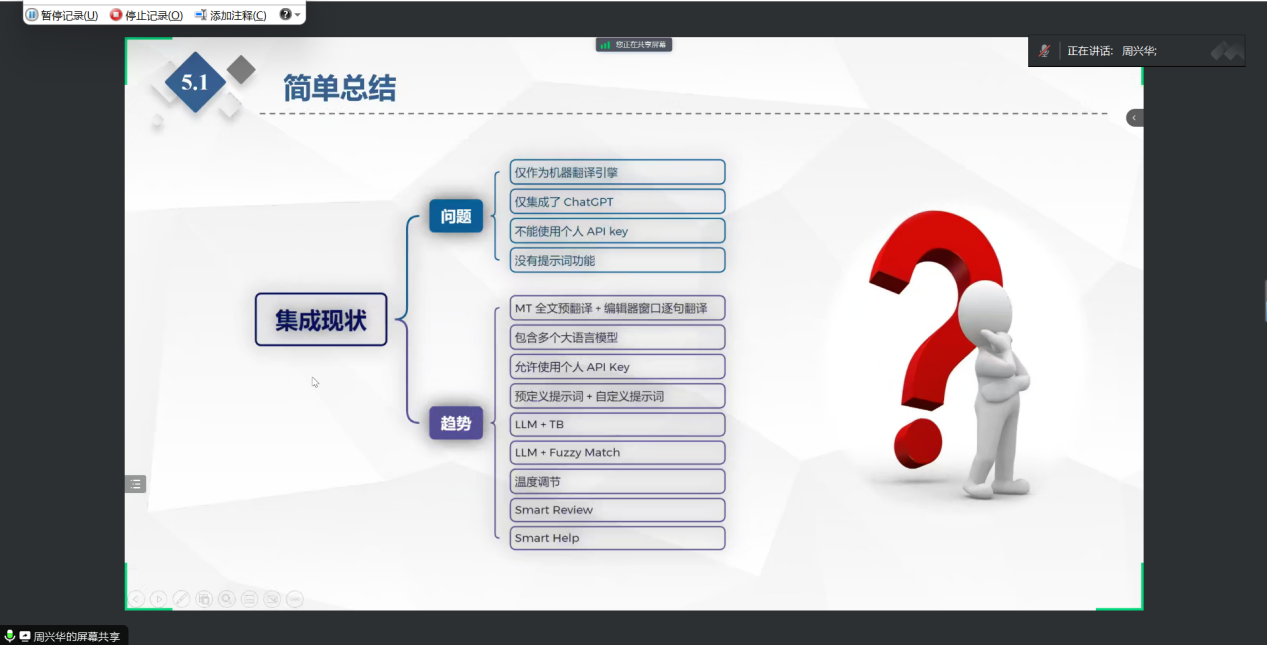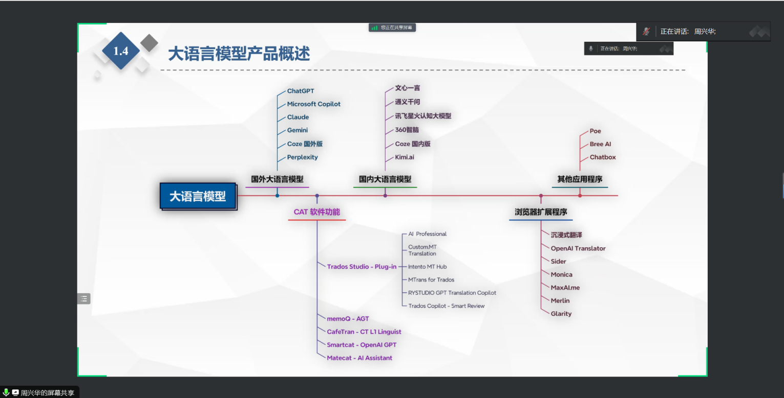 如今,人工智能的时代大势引发了深刻的技术革命、教育变革和数据革命,同时翻译技术也成为了翻译教学和实践中不可分割的部分,进一步推动了语言服务行业和高校教育的创新变革,促进了技术与人的和谐共生。为提升语言服务行业各方对翻译技术的认识和应用能力,加强语言服务人才的技术素养,加速语言技术成果的高效转化,2024年4月1日晚,南航taptap点点官方网站MTI教育中心邀请了翻译技术专家周兴华老师给2023级研究生带来了极具前沿特色的一堂翻译技术课。本次课程,周老师给大家带来了大语言模型与CAT软件的集成及实践应用系列课程,侧重分析和探讨了其应用优势与应用场景。