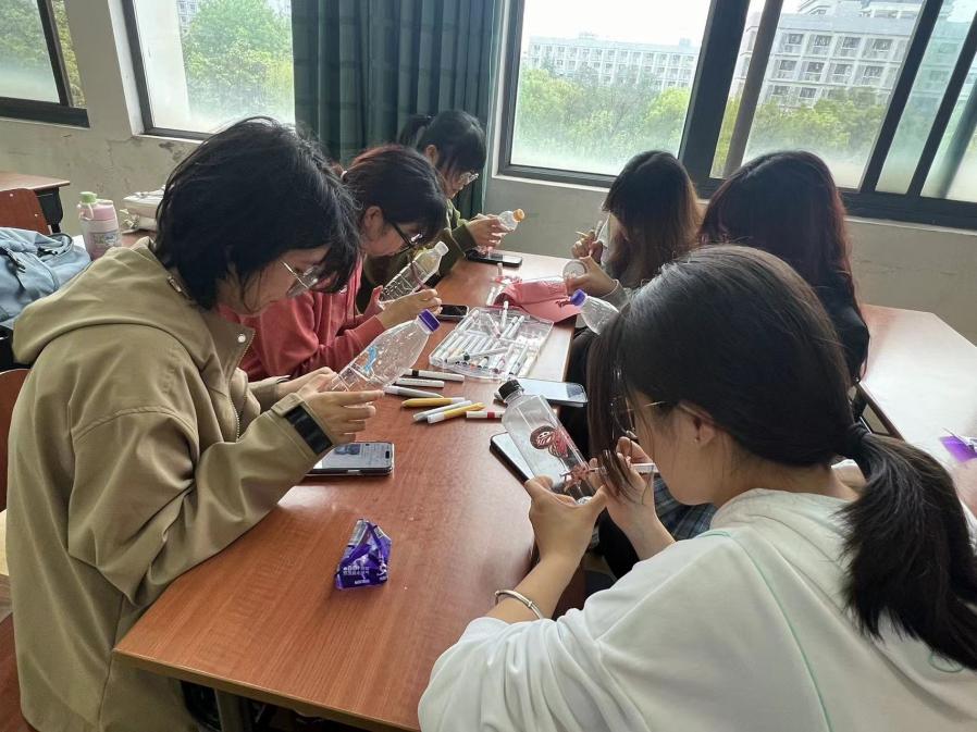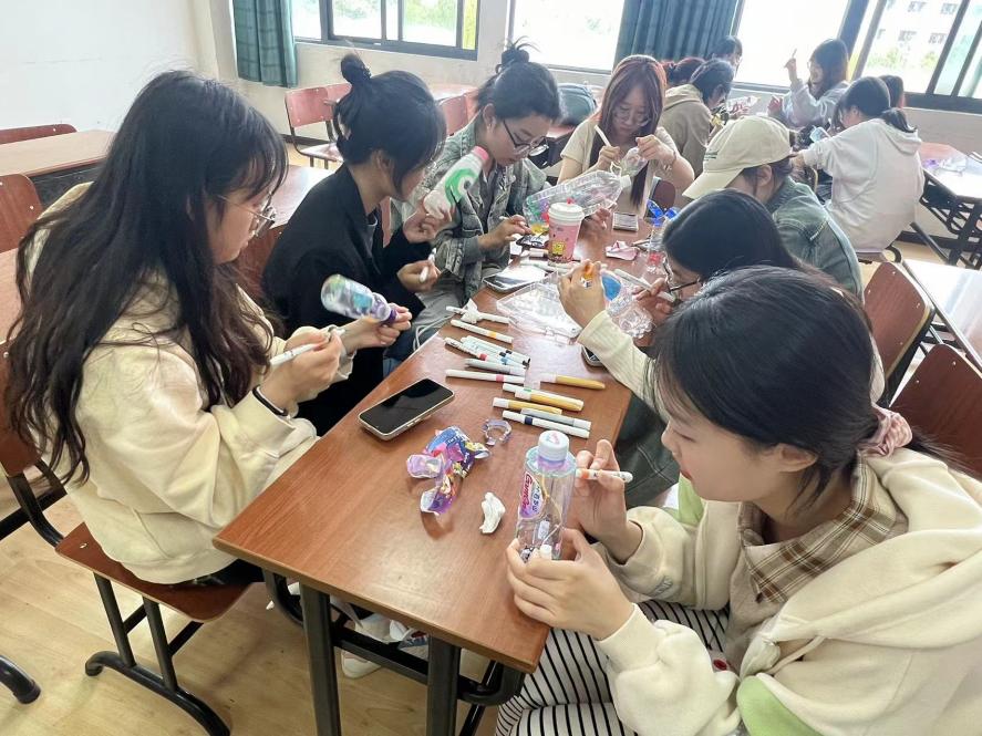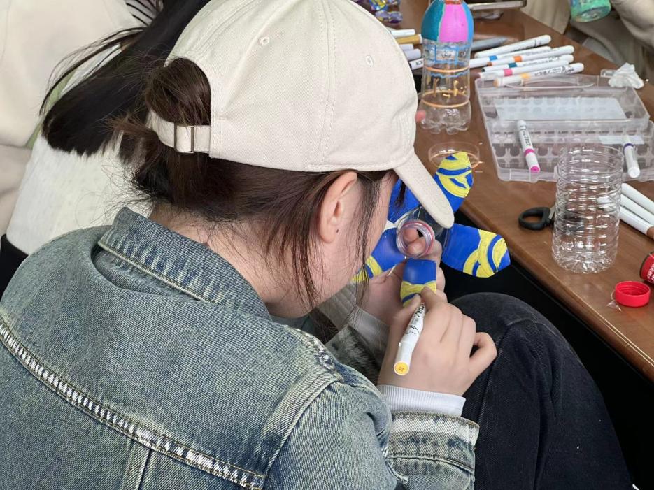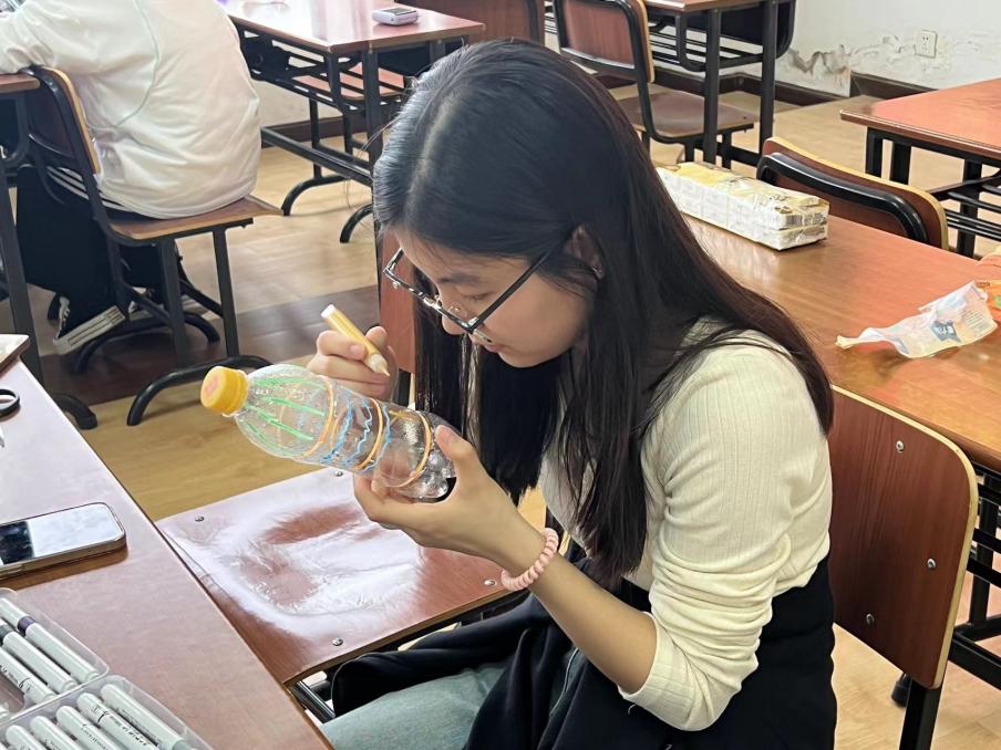 在最后的旧物改造环节,大家拿出事先收集的塑料水瓶,用水彩笔展开了一场创意无限的旧物改造活动。同学们充分发挥自己的想象力,在塑料水瓶上尽情创作,制作出了别具一格的装饰品,赋予了废旧水瓶新的生命和价值。