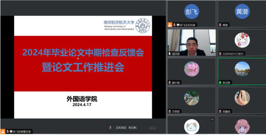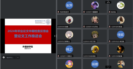 4月17日下午,taptap点点官方网站组织在线召开2024届本科毕业论文中期检查反馈会暨论文工作推进会。学院领导、中期检查工作组督导、英、日语系主任、教学办主任、论文指导老师和全体毕业生共100多名师生参加了会议,徐以中副院长主持会议。