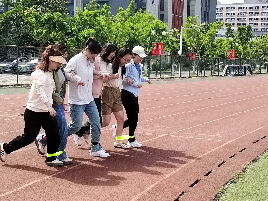 师生默契,携手同行。在“五人六足”中,经过几轮练习,师生们逐渐协调好了整个队伍行进的节奏。口哨声响,各个队伍嘹亮的行进口号声与观众们的呐喊声此起彼伏。师生们在协调配合中加深导学情谊,在团结争先中彰显体育精神,赛场气氛活泼热烈,笑语连连。