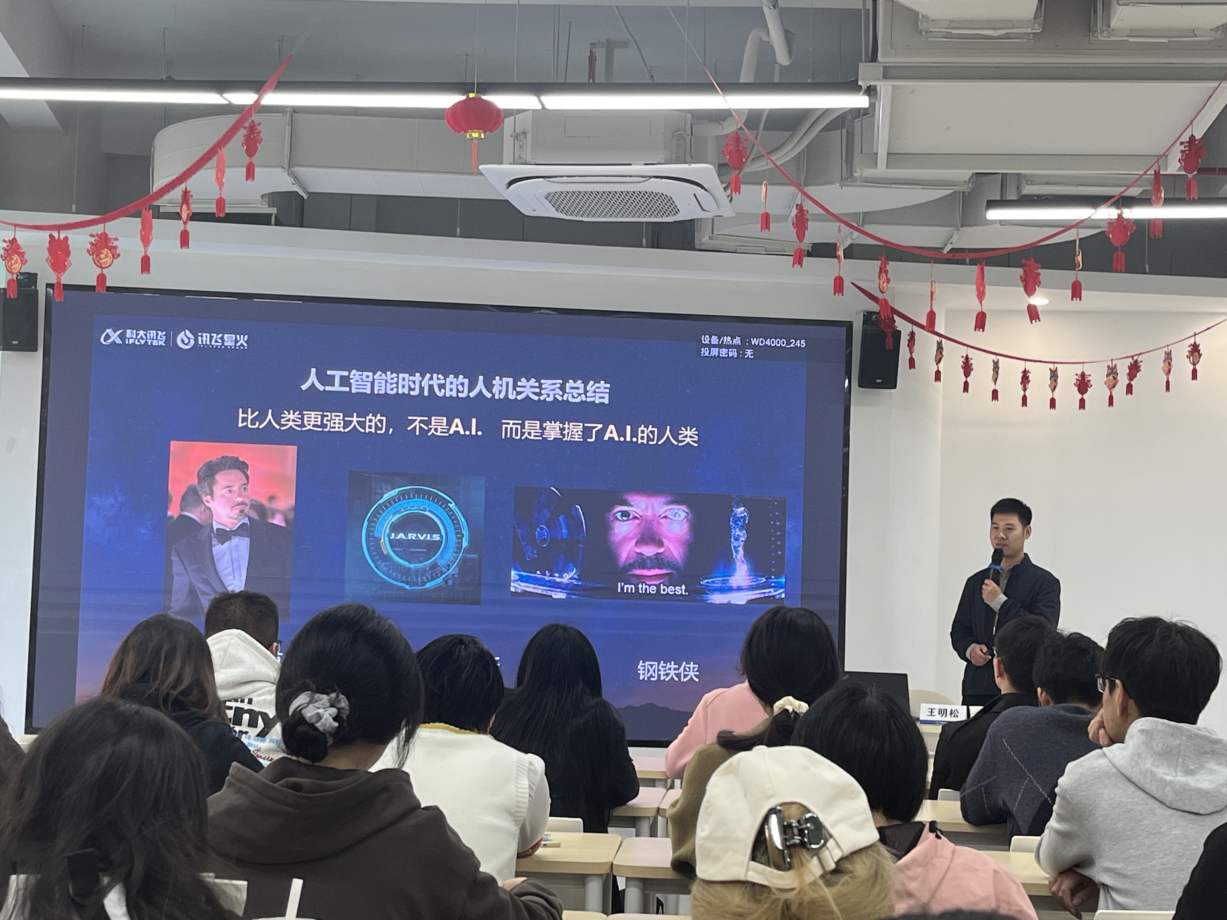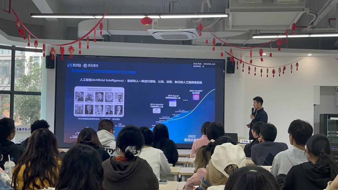 王明松首先以“大模型时代的人工智能技术进展和产业应用”为主题深入探讨了人工智能的发展现状、分析展现了生活实际中的场景应用,并以此为切口展望了未来的发展趋势,从而对同学们提出了个人发展期待。