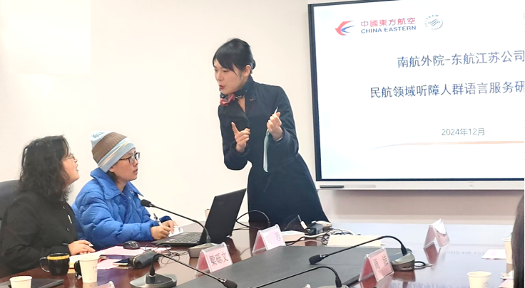 12月19日,taptap点点官方网站与东航江苏公司联合举办民航领域听障人群语言服务研究交流会。东航江苏公司培训中心老师文洪、张玥、东航凌燕组长贺炫及客舱乘务各分部代表与我院院长徐以中、党委副书记吴科颖、团委书记李萍、英语系主任张立新、航空英语研究中心主任王孝存、研究生公共外语教学部教师梁砾文副教授、大学外语教学部许阳博士和部分本科、研究生学生代表参与交流,会议由王孝存主持。
