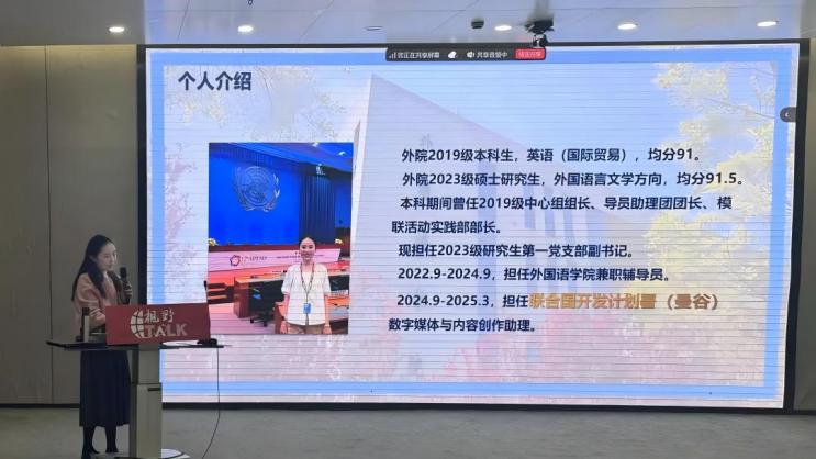 在本次“视野TALK”榜样分享会的现场,曹璐老师和朱芷苑学姐都为我们分享了具体的出国访学和国际组织实习经历,包括各种申请渠道与需要准备的材料。她们的分享让我意识到,外出交流的意义不仅在于学习知识,更在于打破文化壁垒,学会用多元视角看待问题。整场分享会最动人的,是不同讲述者身上闪烁的共同特质:敢于突破舒适区的勇气。这次分享会给予我的不仅是经验地图,更是一颗破除迷茫的种子。"语言人的终极浪漫,是让世界听见更多元的声音。"