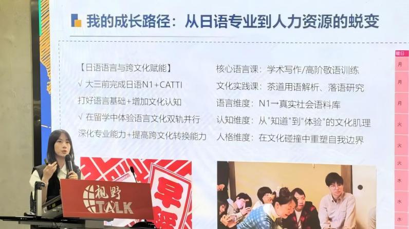 参加此次“视野TALK”榜样分享会我收获很多。直系学姐苏玥从日语专业跨界到人力资源的经历,让我明白语言专业优势是可迁移的。学姐给出的 “外语 +” 成长路线也极具指导意义,从夯实基础到探索跨界可能,再到主动规划职业,为我指明了方向,也激励我积极解锁新的成长曲线。